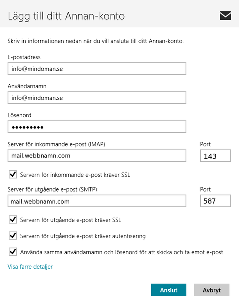 Skriv in mail.webbnamn.com under Server för inkommande e-post (IMAP).